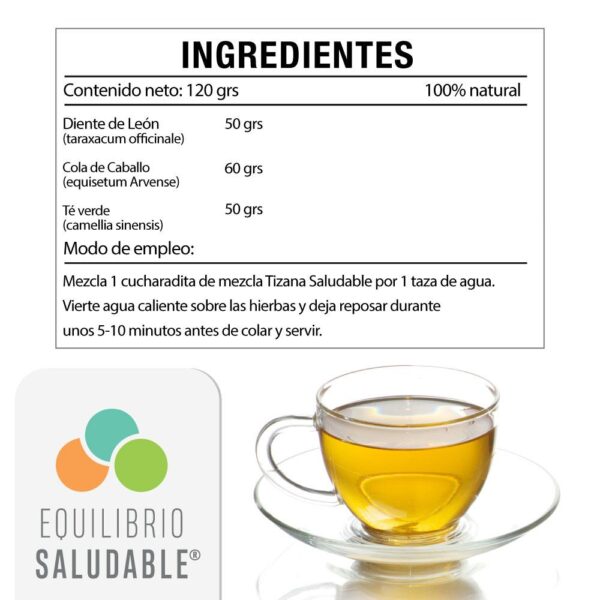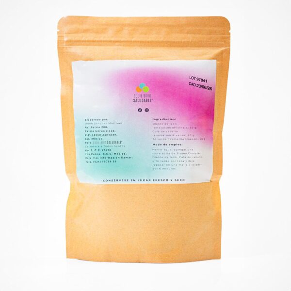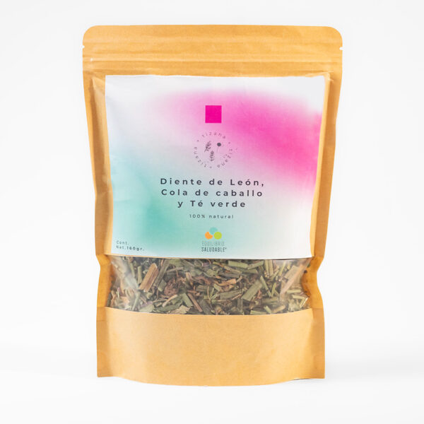 Este té combina los beneficios de la cola de caballo, conocida por su contenido de antioxidantes y su apoyo a la salud del sistema urinario; el té verde, que puede ayudar a mejorar el metabolismo y proporcionar una dosis de antioxidantes; y el diente de león, que se cree que tiene propiedades desintoxicantes y puede ayudar a la digestión y la salud del hígado.